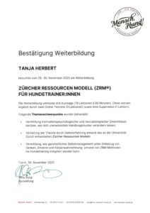 Im November 2025 habe ich bei Vera Bürgi das Zertifikat des „Züricher Ressourcenmodell (ZRM®) – Mensch, Hund!“ erworben. Seitdem darf ich das Training über diesen Weg anbieten – und ich freue mich sehr, dir und deinem Hund damit etwas ganz Besonderes für eure gemeinsame Stabilität, innere Stärke und Verbindung weitergeben zu können.